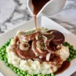 The image shows a white square plate with a serving of mashed potatoes at the center, creamy and slightly textured in off-white color. Around the mashed potatoes, there is a layer of bright green peas, fresh and round. On top of the mashed potatoes, there are three thick slices of brown meat covered with a glossy dark brown onion gravy, with visible cooked onions mixed in. The gravy is being poured from a white sauce pitcher held by a woman's hand above the plate. Small green herbs are sprinkled on top for garnish. The plate is set on a white marbled surface. photo taken with an iphone --ar 4:5 --v 7