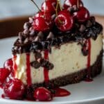 This decadent Black Forest Cheesecake combines a rich cocoa-flavored cake base with a creamy chocolate cheesecake filling, topped with classic cherry pie filling, whipped cream, and chocolate shavings. Perfect for dessert lovers seeking a luscious and visually stunning treat with the iconic flavors of Black Forest cake transformed into a cheesecake.
