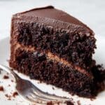 A close-up of a slice of chocolate cake with two thick dark brown layers of moist cake separated by a thin layer of lighter brown creamy frosting. The outside edges of the slice are covered with a smooth, dark chocolate frosting. The slice sits on a white plate with small crumbs around it and a silver fork resting beside the cake. The background is a soft white marbled texture. Photo taken with an iphone --ar 4:5 --v 7