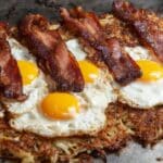 - Assemble and finish: After the eggs and bacon are cooked, place the bacon slices on top of the hashbrowns and eggs. Sprinkle the shredded cheddar cheese over the entire dish. Wait until the cheese melts, then serve immediately. Season with additional salt and pepper if desired, and enjoy!