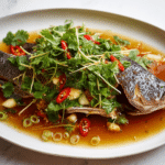 This Cantonese-Style Steamed Fish recipe features a whole white-fleshed fish or fillets delicately steamed over aromatics like cilantro, ginger, and scallions, then dressed with a savory soy-sherry sauce and sizzling hot oil poured over fresh herbs and chili for an authentic, flavorful Chinese dish. Perfectly moist and tender with vibrant fragrant notes, it’s an elegant yet simple preparation highlighting traditional Chinese steaming techniques.