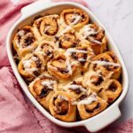 The image shows a white baking dish filled with multiple cinnamon rolls arranged closely together. Each cinnamon roll has a golden-brown baked dough layer with swirls of dark cinnamon filling inside. On top, there is a thin layer of white glaze drizzled across the cinnamon rolls, adding a shiny texture. The dish sits on a white marbled surface with a pink background and a pink and white striped cloth to the left side. Photo taken with an iphone --ar 4:5 --v 7