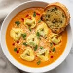 This creamy, comforting Cheesy Tomato Tortellini Soup combines tender cheese tortellini with a rich tomato soup base enhanced by sun dried tomatoes, fragrant herbs, and a generous amount of Parmesan cheese, making it a perfect warm meal for any day.
