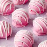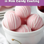 - Drizzle Almond Bark: Using a spoon or candy dipper, drizzle thin ribbons of melted white almond bark over the pink-coated cheesecake bites for an elegant finishing touch.