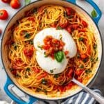 A vibrant and fresh Cherry Tomato Pasta featuring sweet cherry tomatoes sautéed with garlic and red pepper flakes, tossed with al dente spaghetti, fresh basil, and parmesan cheese. Optionally topped with creamy burrata for a decadent finish. This quick and easy recipe is perfect for a flavorful weeknight dinner.