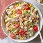 Keywords: chicken pasta salad, Greek yogurt pasta salad, healthy pasta salad, fusilli pasta recipe, make-ahead salad