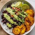 7. Serve: To assemble, serve the warm black bean mixture over cooked rice or grain of choice and top generously with the creamy avocado cilantro sauce. Enjoy immediately for best flavor and texture.