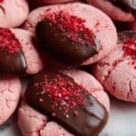 Delight in these decadent Chocolate Covered Strawberry Cookies, featuring a tender vanilla-strawberry dough infused with freeze-dried strawberries and strawberry jam, finished with a luscious drizzle of melted dark chocolate. Perfectly soft with a subtle fruity twist, these cookies are a beautiful treat for any occasion.