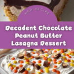 This decadent Chocolate Peanut Butter Lasagna is a no-bake layered dessert combining a crunchy Nutter Butter cookie crust, a creamy peanut butter cheesecake layer, rich chocolate pudding, and fluffy whipped topping. Finished with colorful Reese’s Pieces for a playful and irresistible treat, perfect for any peanut butter and chocolate lover.