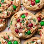 Sweet and salty Christmas Kitchen Sink Cookies packed with pretzel and potato chip pieces, red and green M&M’s, white chocolate chips, and festive sprinkles. These chewy, flavorful cookies bring holiday fun and a delightful mix of textures, perfect for any Christmas cookie platter or holiday treat.
