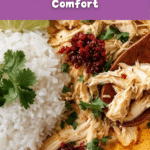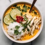 This Coconut Chicken Brothy Rice is a comforting one-pot meal that combines tender chicken thighs simmered in a fragrant coconut milk and chicken broth base, infused with garlic, ginger, curry powder, and turmeric. Served over fluffy jasmine rice and garnished with fresh green onions, cilantro, and lime wedges, it’s a flavorful and aromatic dish perfect for cozy dinners.