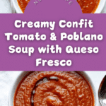 Keywords: tomato soup, poblano peppers, confit vegetables, queso fresco, vegetarian soup, creamy soup, Mexican soup