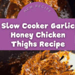 Keywords: crockpot garlic honey chicken thighs, slow cooker chicken thighs, honey garlic chicken crockpot, easy crockpot chicken recipe, shredded chicken thighs