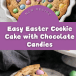 This Easter Cookie Cake is a festive twist on a classic chocolate chip cookie, baked in a pie plate and topped with colorful holiday candies. It’s perfect for sharing at spring gatherings or as a fun, seasonal treat.