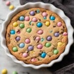 This Easter Cookie Cake is a festive twist on a classic chocolate chip cookie, baked in a pie plate and topped with colorful holiday candies. It’s perfect for sharing at spring gatherings or as a fun, seasonal treat.