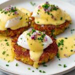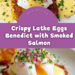 This Easy Latke Eggs Benedict recipe combines crispy homemade potato pancakes with delicate poached eggs, rich hollandaise sauce, and smoked salmon for an elevated brunch classic. The latkes are golden and crunchy, balanced by the silky sauce and tender poached eggs, garnished with chives and red onion for a burst of flavor and color.