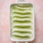 - Soak Lady Fingers: Quickly dip each lady finger into the cooled matcha mixture, being careful not to soak them too long to avoid sogginess. Arrange a single layer of soaked lady fingers evenly in a casserole or serving dish. Sift a light dusting of matcha powder over the layer.