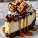 Keywords: Snickers cheesecake, easy cheesecake recipe, chocolate candy cheesecake, creamy dessert, graham cracker crust cheesecake