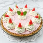 A pie with a golden brown crumb crust forms the base layer, topped with a thick, light pink creamy filling that looks smooth but with small red flecks inside. On the surface, there are seven large white whipped cream swirls evenly spaced around the pie's edge and one in the center. Each whipped cream swirl is decorated with a small triangular slice of watermelon showing green rind and red flesh, and the center swirl has fresh green mint leaves behind the watermelon slice. The pie sits in a clear glass pie dish on a white marbled surface with a white lace paper doily underneath. photo taken with an iphone --ar 4:5 --v 7
