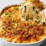 A large white bowl filled with a creamy baked rice dish topped with golden brown crispy fried onions and small green herbs sprinkled on top. The dish has a thick, gooey texture with melted cheese stretching as a spoon lifts a portion. Inside the lifted scoop, visible shredded pieces of chicken are mixed with the creamy rice, creating a rich, textured look. The top layer is crunchy and browned, while the layers underneath appear soft, cheesy, and moist. The bowl sits on a white marbled surface. photo taken with an iphone --ar 4:5 --v 7