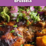 This Hot Honey Chicken Thighs recipe pairs juicy, flavorful chicken with roasted sweet potatoes and Brussels sprouts for a deliciously sweet and spicy meal. The chicken is marinated in a blend of honey, garlic, spices, and olive oil, then roasted to perfection alongside tender vegetables. Finished with a drizzle of hot honey, crumbled goat cheese, and fresh cilantro, this dish offers a perfect balance of savory, sweet, and spicy flavors.
