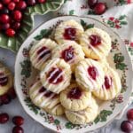 A white plate with a green holly leaf and red berry pattern is filled with many round cookies, each with a slightly crumbly pale yellow base and a small red cranberry in the center. The center cranberry layer is shiny and juicy with a bit of red syrup spreading out. On top of each cookie, there are thin white icing stripes drizzled evenly. Around the plate and scattered on the white marbled surface are whole red cranberries. In the background, there is a green leaf shaped dish holding more cookies and cranberries on a white cloth with holly prints. Photo taken with an iphone --ar 4:5 --v 7