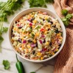 Keywords: Mexican coleslaw, tri-color coleslaw, Mexican salad, creamy coleslaw, spicy coleslaw, side dish, taco seasoning, black beans salad