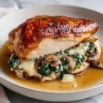 This Mushroom Stuffed Chicken Breast recipe features tender chicken breasts filled with a savory mixture of sautéed mushrooms, fresh spinach, garlic, thyme, and melted mozzarella cheese. The chicken is seasoned, seared for a golden crust, and then baked to juicy perfection, making a flavorful and impressive dish perfect for weeknight dinners or special occasions.