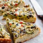 The image shows three slices of thick-crust vegetable pizza placed on white parchment paper over a white marbled surface. Each slice has a golden-brown crust with a soft, fluffy inside, topped with a textured layer of melted white cheese mixed with green zucchini slices, black olive pieces, small red spots of diced tomatoes, and bits of herbs. The topping layer looks creamy and evenly spread, with colors mainly white, green, black, and red. A large knife with a silver blade and black handle rests on the right side of the image. The focus is on the front pizza slice, with the two others slightly blurred behind it. photo taken with an iphone --ar 4:5 --v 7