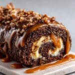 This Irresistible Peanut Butter Cup Chocolate Roll features a light and airy chocolate sponge cake filled with a creamy peanut butter filling and chopped peanut butter cups. Finished with an optional silky chocolate ganache, this dessert perfectly balances rich chocolate and nutty sweetness, making it a delightful treat for any occasion.