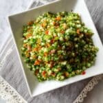 A white square bowl filled with finely chopped vegetables piled high, showing a mix of small green pieces, tiny white chunks, and scattered bright orange bits, creating a colorful and fresh texture; the bowl rests on a gray cloth with lace edges on a white marbled surface. photo taken with an iphone --ar 4:5 --v 7