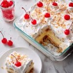 Keywords: Piña Colada Lasagna, no-bake dessert, tropical dessert, coconut lime dessert, pineapple dessert, layered dessert, easy no bake, summer dessert