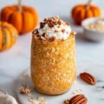 - Add Toppings: Top the oats with your choice of chopped pecans, whipped cream, additional yogurt, or granola to add texture and extra flavor. Enjoy your pumpkin pie-flavored breakfast!