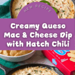 Keywords: Queso dip, mac and cheese dip, cheesy appetizer, hatch chili, snack, party dip, chip dip, easy queso