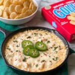Keywords: Queso dip, mac and cheese dip, cheesy appetizer, hatch chili, snack, party dip, chip dip, easy queso
