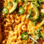 - Garnish and Serve: Remove the baked mac & cheese from the oven and top with sliced avocado, pickled jalapeños, and chopped fresh cilantro. Serve warm and enjoy your creamy, smoky queso mac & cheese!