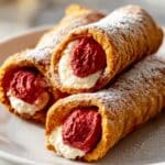 These Red Velvet Cannoli combine the classic Italian cannoli with a festive red velvet twist. Crispy, cocoa-infused shells are fried to perfection and filled with a smooth, creamy cream cheese filling tinted with red food coloring for a vibrant presentation. Finished with a decadent dip in mini chocolate chips, crushed pistachios, and dusted with powdered sugar and cocoa powder, these cannoli are perfect for special occasions or dessert lovers craving a rich, velvety treat.