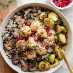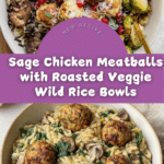These Sage Chicken Meatballs Wild Rice Bowls feature tender chicken meatballs infused with fresh sage, baked alongside roasted Brussels sprouts and baby bella mushrooms. Served over hearty wild rice and drizzled with a savory sage butter garlic sauce, this wholesome meal balances comforting flavors with fresh, vibrant ingredients and a touch of sweetness from pomegranate arils.