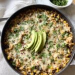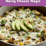 - Garnish and serve: Top the skillet with fresh chopped cilantro and optional avocado slices and red pepper flakes. Serve warm and enjoy your flavorful, cheesy salsa verde chicken and rice skillet!