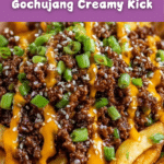 Savory Bulgogi Fries with Spicy Gochujang Aioli Delight combines tender marinated beef bulgogi layered over crispy fries, melted mozzarella cheese, and a spicy-sweet gochujang aioli. Topped with kimchi, fresh scallions, cilantro, and toasted sesame seeds, this Korean-inspired fusion dish is perfect for sharing and bursting with umami, sweetness, and heat in every bite.