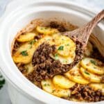 Keywords: slow cooker beef recipe, potatoes au gratin, ground beef casserole, easy slow cooker dinner, layered beef and potatoes