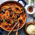 This Spicy Tomato One-Pan Pasta is a flavorful and easy-to-make dish combining linguine with a zesty tomato sauce, Kalamata and garlic-stuffed olives, and fresh herbs, all cooked together in one pan for convenience and rich taste.