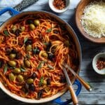 Keywords: spicy tomato pasta, one-pan pasta, linguine recipe, Mediterranean pasta, olives pasta