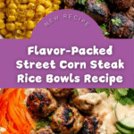 A vibrant and flavorful Street Corn Steak Rice Bowl featuring tender grilled flank steak, charred corn, and fresh vegetables served over fluffy white rice, topped with a zesty chili-lime cream sauce and crumbly cotija cheese. This recipe combines smoky, creamy, and fresh elements for a satisfying and colorful meal perfect for a quick dinner or casual gathering.