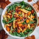 - Combine the Salad: In a large mixing bowl, combine the cooked pasta, roasted sweet potatoes, crumbled bacon, and arugula. Pour the prepared dressing over the mixture and toss gently to coat everything evenly.