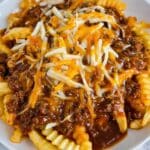 A delicious Tex Mex twist on classic poutine featuring crispy crinkle cut fries topped with seasoned ground beef, melted Tex Mex cheese blend, and rich brown gravy. This comforting dish combines the flavors of Mexican-style seasoning with the traditional Canadian favorite, perfect for a hearty meal.