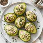 A quick and healthy Tuna Stuffed Avocados recipe perfect for a light lunch or snack. Creamy avocados are filled with a flavorful tuna salad made from albacore tuna, mayonnaise, fresh celery, red onion, herbs, and tangy Dijon mustard, offering a creamy, savory, and nutritious meal that is easy to prepare.