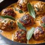Hearty and comforting Turkey Meatballs in Pumpkin Sage Sauce make a perfect cozy dinner, blending lean ground turkey meatballs with a creamy, earthy pumpkin and fresh sage sauce. This delicious dish offers a unique autumn-inspired flavor, perfect for family meals and chilly nights.